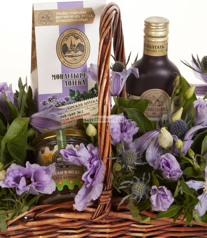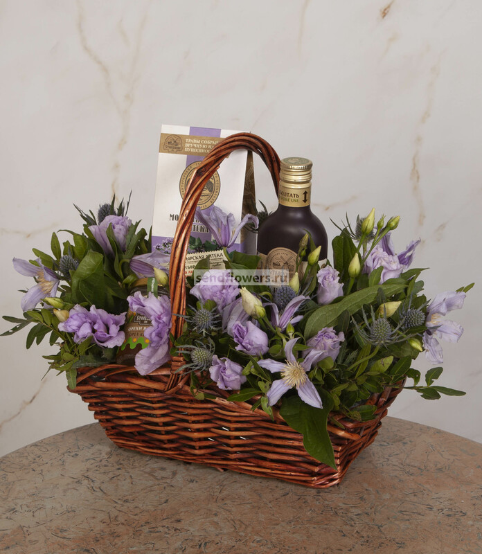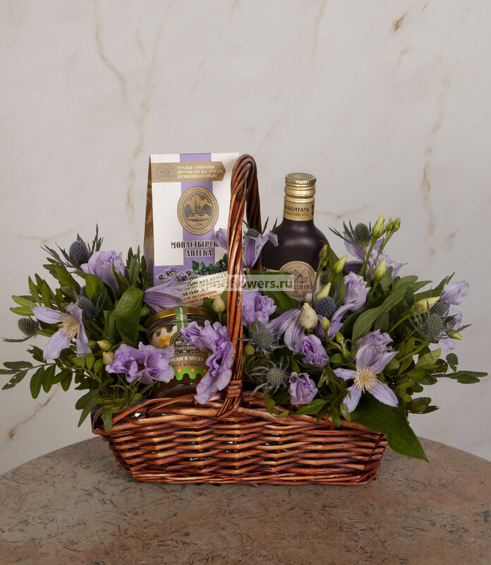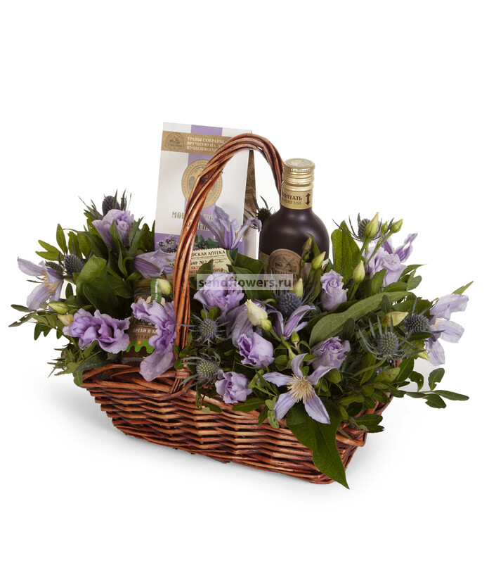 Состав: Оазис кирпич (1), Корзина малая (1), Лента натуральная (3), Клематис (2), Фисташка (3), Эустома сиреневая (3), Эрингиум (3), Сбитень "Столбушинский" Можжевеловый 250 мл. стекло (1), Орехи в меду "Столбушинские" Кешью 160 г. стекло (1), Травяной сбор "Столбушинский" No2 (чабрец, зверобой, смородина лист, малина лист) (1)